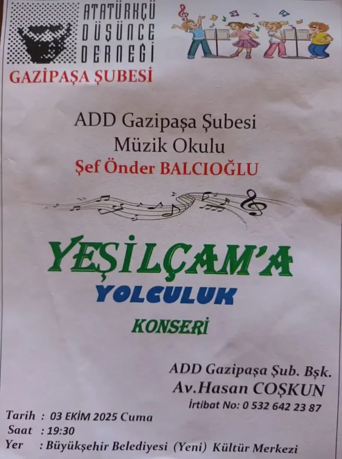 Atatürkçü Düşünce Derneği (ADD) Gazipaşa Şubesi, ilçeyi Türk Sanat Müziği’nin unutulmaz eserleriyle buluşturuyor. 3 Ekim 2025 Cuma günü saat 19.30’da Antalya Büyükşehir Belediyesi Gazipaşa Kültür Merkezi’nde gerçekleşecek konserde, Yeşilçam’ın hafızalara kazınan şarkıları seslendirilecek.