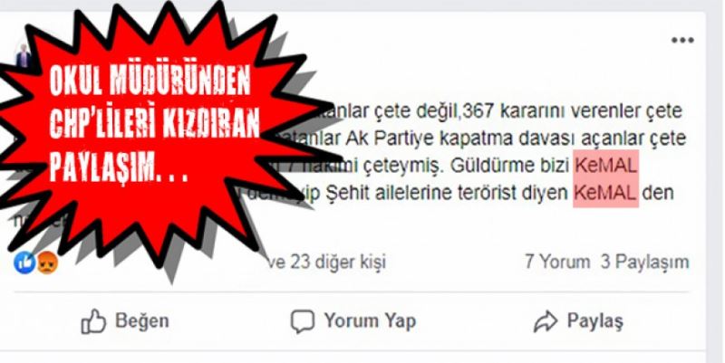 OKUL Müdürü Ebubekir Asa’nın 10 Mayıs Cuma günü sosyal medya hesabından CHP Genel Başkanı Kemal Kılıçdaroğlu hakkında yaptığı paylaşım her kesimden tepki aldı. Okul Müdürü Asa paylaşımında, “Erdoğan'ı Bir Şiir yüzünden hapse atanlar çete değil, 367 kararını verenler çete değil, Refah, Fazilet partisini kapatanlar, Ak Partiye kapatma davası açanlar çete değil, YSK’nın iptal kararı veren 7 hakimi çeteymiş. Güldürme bizi KeMAL. Gerçi YPG’ye terör örgütü demeyip şehit ailelerine terörist diyen KeMAL’den ne beklenir ki” ifadelerini kullandı.