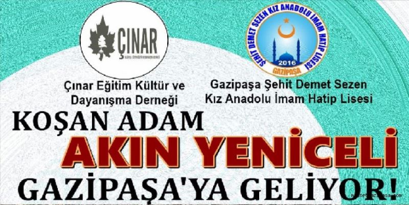 Çınar Gazipaşa Eğitim Kültür ve Dayanışma Derneği ve Şehit Demet Sezen Kız Anadolu İmam Hatip Lisesi işbirliği ile ‘Koşan Adam’ olarak bilinen ultra maraton sporcusu Akın Yeniceli, Gazipaşa’ya geliyor.