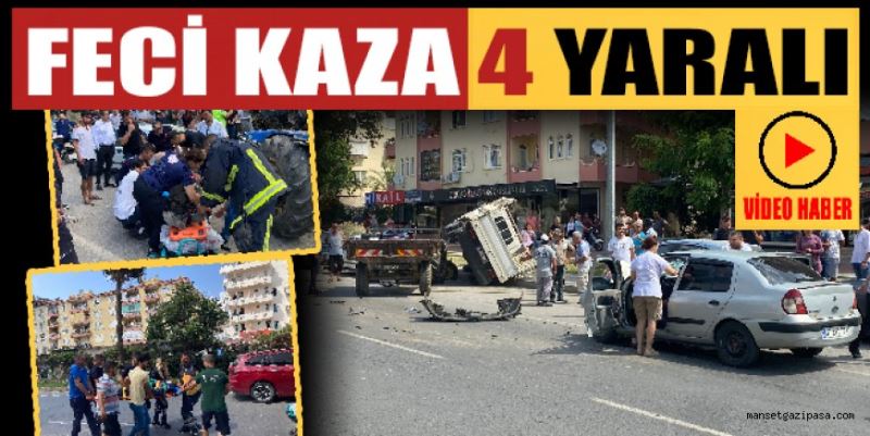 Gazipaşa’da otomobil, traktör ve park halinde bekleyen kamyonetin karıştığı trafik kazasında 4 kişi yaralandı. Kaza, saat 10.00 sıralarında İstiklal Mahallesi Milli Egemenlik Bulvarı D-400 Karayolu üzerinde meydana geldi. Edinilen bilgiye göre, Gazipaşa’dan Alanya istikametine seyir halinde olan Şenolcan Ö.(19) idaresindeki 07 ATL 771 plakalı otomobil, aynı yönde seyir halinde olan Mahmut Ö.’nün(55) kullandığı 07 UJ 267 plakalı traktörün römorkuna arkadan çarptı. Çarpışmanın etkisiyle sürücüsünün direksiyon hakimiyetini kaybettiği traktör, yolun sağında park halinde bekleyen 07 ABC 273 plakalı kamyonete çarptı. Çarpışmanın etkisiyle kamyonet kaldırıma devrildi. Meydana gelen feci kazada, traktör sürücüsü Mahmut Ö, otomobil sürücüsü Şenolcan Ö. ile otomobilde yolcu olarak bulunan Döne Ö.(67) ve Buğra Y.(13) yaralandı.