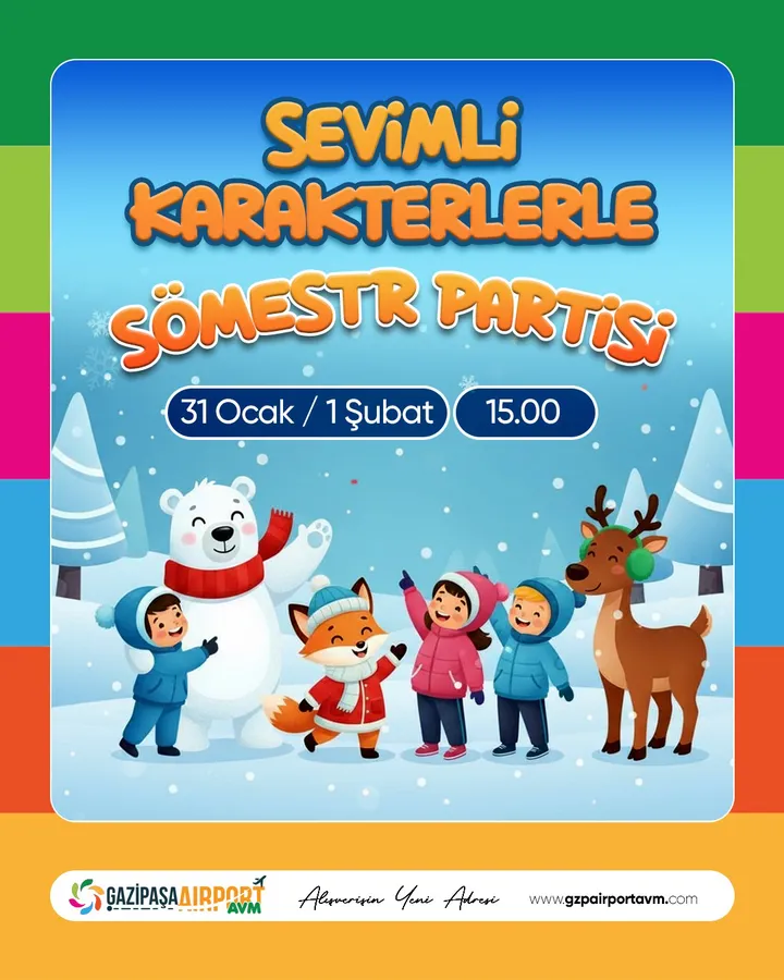 Gazipaşa Airport AVM, yarıyıl tatilinde çocuklara özel renkli ve eğlenceli bir etkinliğe ev sahipliği yapmaya hazırlanıyor. “Sevimli Karakterlerle Sömestr Partisi” adıyla düzenlenecek etkinlikte, Gazipaşalı çocuklar eğlence dolu saatler yaşayacak. 31 Ocak ve 1 Şubat tarihlerinde gerçekleştirilecek etkinlikte, çocuklar sevimli karakterler eşliğinde oyunlar oynayacak, müzik ve eğlenceyle tatilin keyfini çıkaracak. Program kapsamında çılgın yarışmalar, eğlenceli oyunlar ve çeşitli sürpriz etkinlikler minik ziyaretçilerle buluşacak.