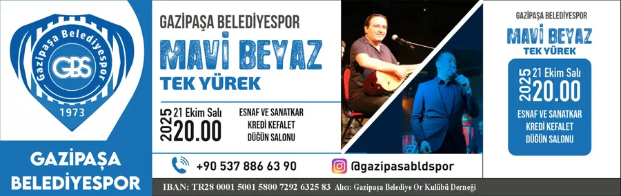 Gazipaşa Belediyespor, yeni sezon öncesi dayanışma konseri düzenliyor. 21 Ekim’de yapılacak “Mavi-Beyaz Tek Yürek” konserinde Gazipaşalı sanatçı Ali Aksoy ve sevilen sanatçı Serdar Onur sahne alacak. Elde edilecek gelir, kulübün yeni sezon çalışmalarında kullanılacak.