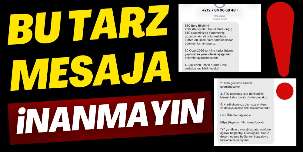 Son günlerde vatandaşlara gönderilen “ETC borcu” içerikli mesajlarla dolandırıcılık girişimleri arttı. Gazipaşa’da yaşayan vatandaşlara da gönderilen yurt dışı kaynaklı mesajda Karayolları Genel Müdürlüğünün adı kullanılarak, ceza ve yasal işlem tehdidiyle vatandaşlar üzerinde korku ve panik yaratılmaya çalışılıyor. Vatandaşlara gönderilen mesajlarda, ETC sisteminde ödenmemiş geçiş ücreti bulunduğu iddia ediliyor. Mesajlarda belirli bir tarihe kadar ödeme yapılmaması halinde gecikme zammı uygulanacağı, hizmetin durdurulacağı, kredi notunun olumsuz etkileneceği ve dava açılabileceği gibi ifadeler yer alıyor.