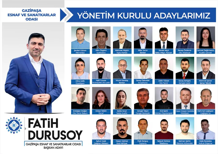 Fatih Durusoy’un paylaştığı yönetim kurulu listesi; ilçede ticari hayatın farklı alanlarında faaliyet gösteren, sahada karşılığı olan ve esnaf tarafından yakından tanınan isimlerden oluştu. Listenin, yaş, meslek ve bakış açısı çeşitliliğiyle Gazipaşa esnafının genel yapısını yansıttığını ifade eden Durusoy, “Kadromuzun kapsayıcı yapısıyla esnaflarımızla birlikte çözüm üreten, icraat yapan bir oda olacağız” dedi.