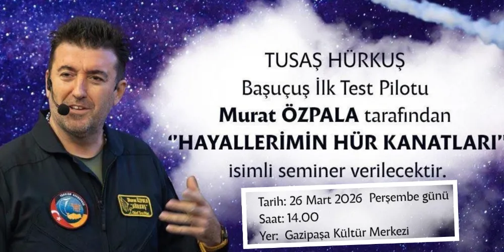 Gazipaşa’da öğrenciler, ilham verici bir seminerde önemli bir isimle buluşacak. İlçe Milli Eğitim Müdürlüğü tarafından düzenlenen etkinlik kapsamında, TUSAŞ Hürkuş Başuçuş İlk Test Pilotu Murat Özpala öğrencilerle bir araya gelecek. “Hayallerimin Hür Kanatları” adlı seminer, bugün (26 Mart 2026 Perşembe) saat 14.00’te Antalya Büyükşehir Belediyesi (ABB) Gazipaşa Kültür Merkezi’nde gerçekleştirilecek.