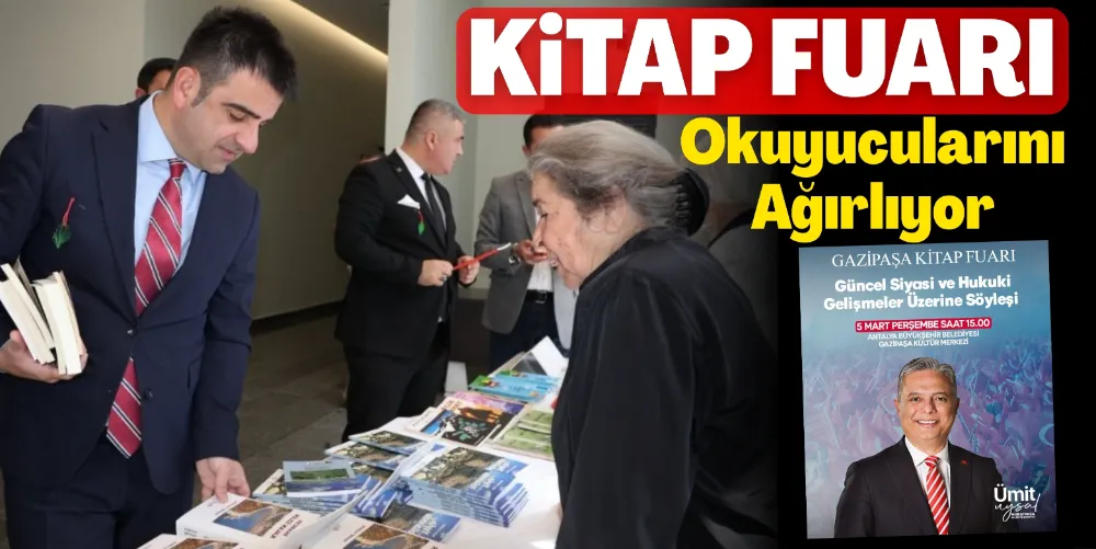 Fuar kapsamında bugün Antalya Muratpaşa Belediye Başkanı Ümit Uysal Gazipaşa’da olacak. Uysal, saat 15.00’te Antalya Büyükşehir Belediyesi Gazipaşa Kültür Merkezi’nde “Güncel Siyasi ve Hukuki Gelişmeler Üzerine” başlıklı söyleşide kitapseverlerle bir araya gelecek. Uysal, Gazipaşalı hemşehrilerini söyleşiye davet etti.
