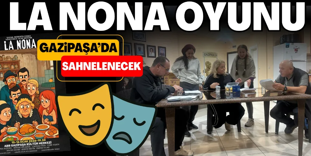 Dünya tiyatro literatürünün dikkat çeken oyunlarından biri olan “La Nona”, Gazipaşalı sanatseverlerle buluşmaya hazırlanıyor. Yazar Roberta Cossa’nın kaleme aldığı, yönetmenliğini eğitimci Suat Ertürk’ün üstlendiği oyun, 15 ve 16 Ocak 2026 tarihlerinde Gazipaşa’da sahnelenecek. Toplumsal hiciv ve kara mizah unsurlarını bir araya getiren “La Nona”, Antalya Büyükşehir Belediyesi (ABB) Gazipaşa Kültür Merkezi sahnesinde tiyatro izleyicisiyle buluşacak. Oyun, her iki gün de saat 19.30’da perde açacak.