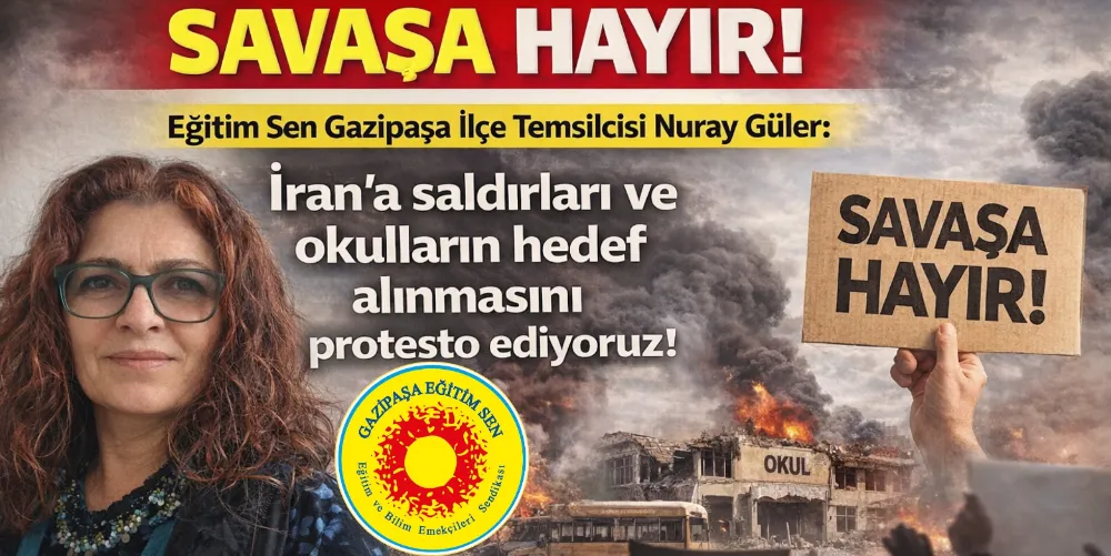 Eğitim Sen Gazipaşa İlçe Temsilcisi Nuray Güler, İran’a yönelik saldırılar ve okulların hedef alınmasına ilişkin yazılı bir açıklama yaparak savaşa ve sivillere yönelik şiddete karşı olduklarını belirtti. Saldırılara karşı tutumlarını ortaya koyan Eğitim Sen Gazipaşa İlçe Temsilcisi Nuray Güler, “İran’a Yönelik Saldırıları ve Okulların Hedef Alınmasını Protesto Ediyoruz! Savaşa ve Sivil Katliamlara Hayır!” dedi.