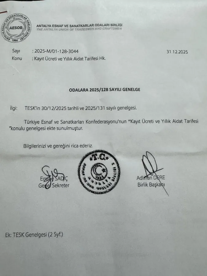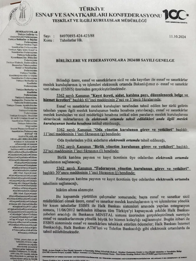 Oda gelirlerinin yasal çerçevesini hatırlatan Sönmez, “5362 sayılı Esnaf ve Sanatkarlar Meslek Kuruluşları Kanunu’na göre kayıt ücreti, yıllık aidat ve basılı evrak bedelleri açık şekilde tanımlanmıştır. Bu ücretlerin tahsili zorunludur, alınmaması ise suçtur” dedi. Sönmez, Türkiye Esnaf ve Sanatkarları Konfederasyonu tarafından yayımlanan 2024/88 ve 2025/131 sayılı genelgelerde, kayıt ücreti ve yıllık aidatların elektronik ortamda tahsil edilmesinin hüküm altına alındığını, bu uygulamanın tüm Türkiye’de bağlayıcı olduğunu belirtti.