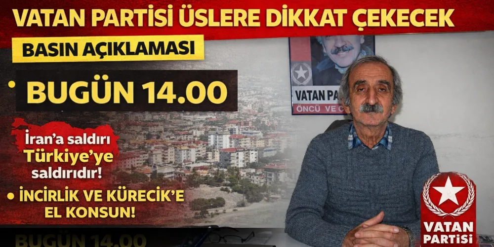 Vatan Partisi Gazipaşa İlçe Başkanlığı, bugün saat 14.00’te Gazipaşa Cumhuriyet Meydanı’ndaki Vakıfbank önünde basın açıklaması yapacak. Açıklamanın, “İran’a saldırı Türkiye’ye saldırıdır” ve “İncirlik ve Kürecik’e el konsun” başlıklarıyla gerçekleştirileceği bildirildi. Konuya ilişkin değerlendirmede bulunan Vatan Partisi Gazipaşa İlçe Başkanı Fikret Çalışkan, “İran’a saldırı Türkiye’ye saldırıdır. İran’ın direnişi Türkiye’nin direnişidir. İran’ın ABD emperyalizmine ve İsrail siyonizmine karşı direnci, bölge ülkeleri ve bütün insanlık içindir” dedi.