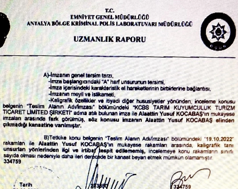Evrak üzerindeki imzanın kendisine ait olmadığını ifade eden Kocabaş, konuyla ilgili girişimde bulundu. Antalya Bölge Kriminal Polis Laboratuvarı Müdürlüğü’nce incelenen imzanın Alaattin Kocabaş’a ait olmadığı ortaya çıktı…