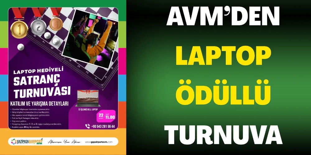 Gazipaşa Airport AVM, satranç tutkunlarını ödüllü bir turnuvada bir araya getirmeye hazırlanıyor. AVM tarafından düzenlenecek satranç turnuvasında birinci olan yarışmacıya laptop ödülü verilecek. Laptop ödüllü satranç turnuvası, 22 Şubat tarihinde saat 11.00’de Gazipaşa Airport AVM’de yapılacak. Turnuva, tek ve açık kategori olarak düzenlenecek olup yarışmaya katılımda yaş sınırı bulunmayacak.