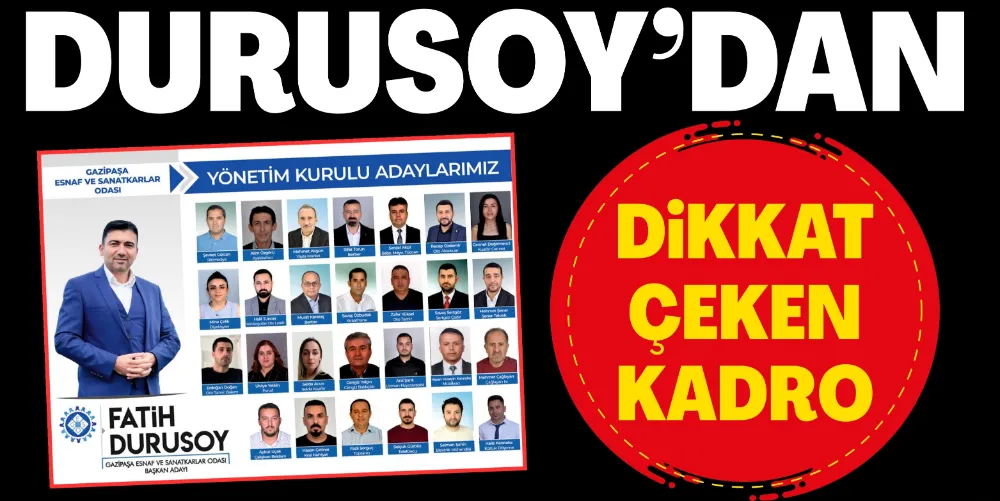 Fatih Durusoy’un paylaştığı yönetim kurulu listesi; ilçede ticari hayatın farklı alanlarında faaliyet gösteren, sahada karşılığı olan ve esnaf tarafından yakından tanınan isimlerden oluştu. Listenin, yaş, meslek ve bakış açısı çeşitliliğiyle Gazipaşa esnafının genel yapısını yansıttığını ifade eden Durusoy, “Kadromuzun kapsayıcı yapısıyla esnaflarımızla birlikte çözüm üreten, icraat yapan bir oda olacağız” dedi.