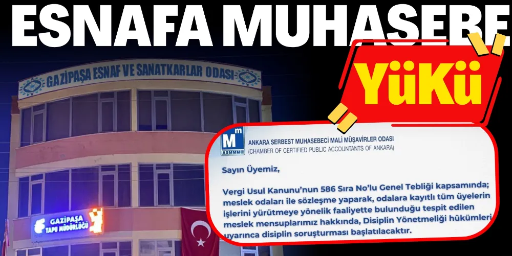 Ankara Serbest Muhasebeci Mali Müşavirler Odası tarafından muhasebecilere gönderilen yazıda: “Vergi Usul Kanunu’nun 586 Sıra No’lu Genel Tebliği kapsamında; meslek odaları ile sözleşme yaparak, odalara kayıtlı tüm üyelerin işlerini yürütmeye yönelik faaliyette bulunduğu tespit edilen meslek mensuplarımız hakkında, Disiplin Yönetmeliği hükümleri uyarınca disiplin soruşturması başlatılacaktır. Konuya gerekli hassasiyetin gösterilmesini rica ederiz” ifadeleri kullanıldı.