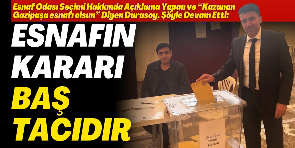Gazipaşa Esnaf ve Sanatkarlar Odası seçimlerinin ardından Fatih Durusoy, esnafın iradesine saygı duyduklarını belirterek birlik ve dayanışma mesajı verdi. “Esnafımızın kararı başımızın tacıdır” diyen Durusoy, “Kazanan Gazipaşa esnafı olsun” dedi.